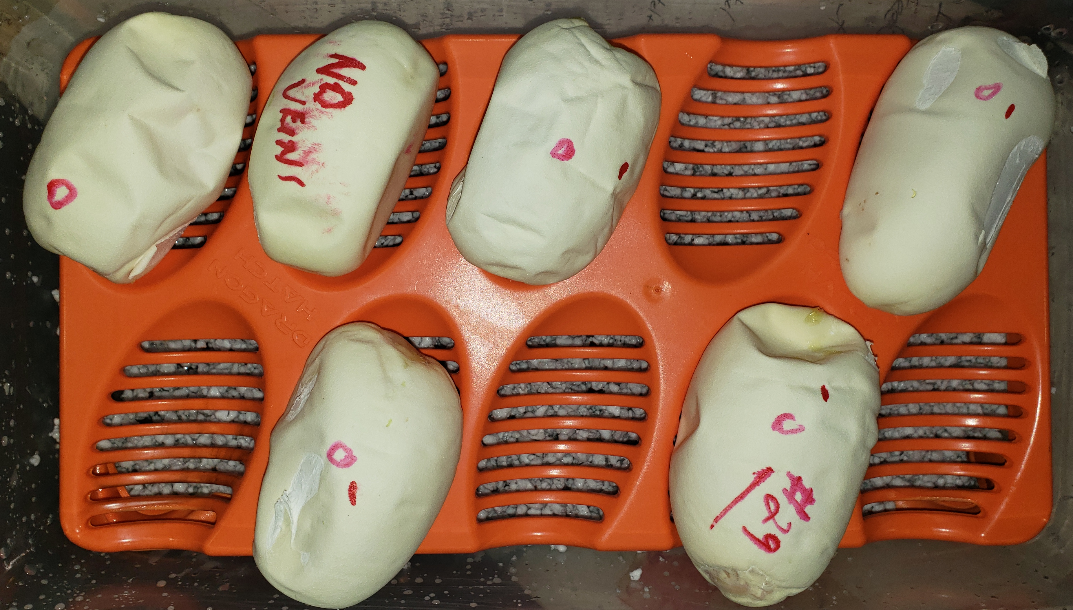 due 8-9-24 6 eggs, 1 deflated, 5 good, 1 leaking and patched